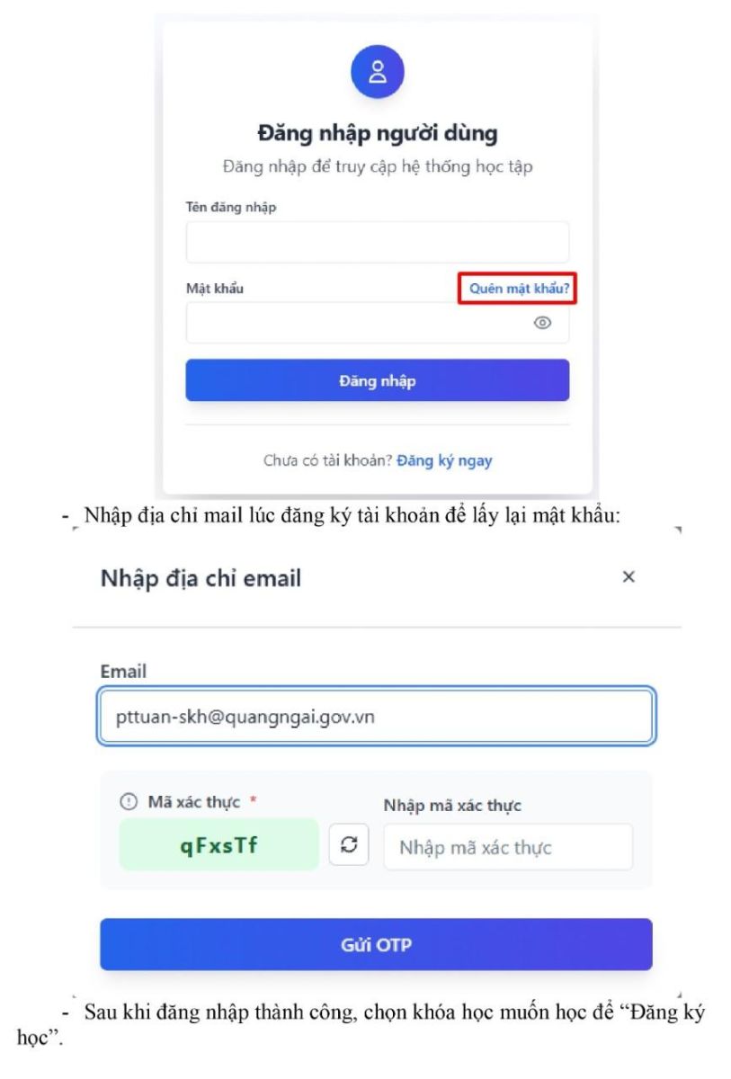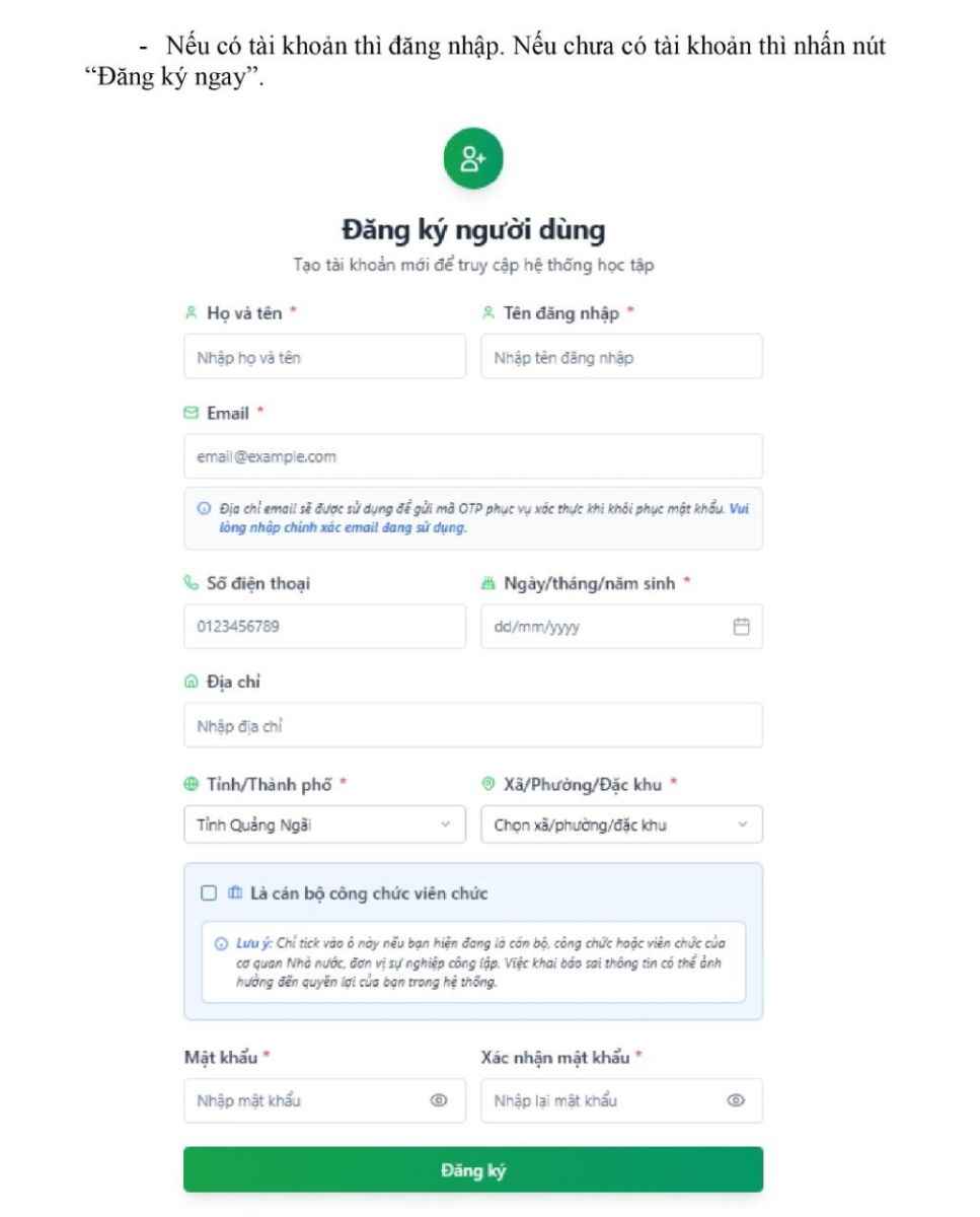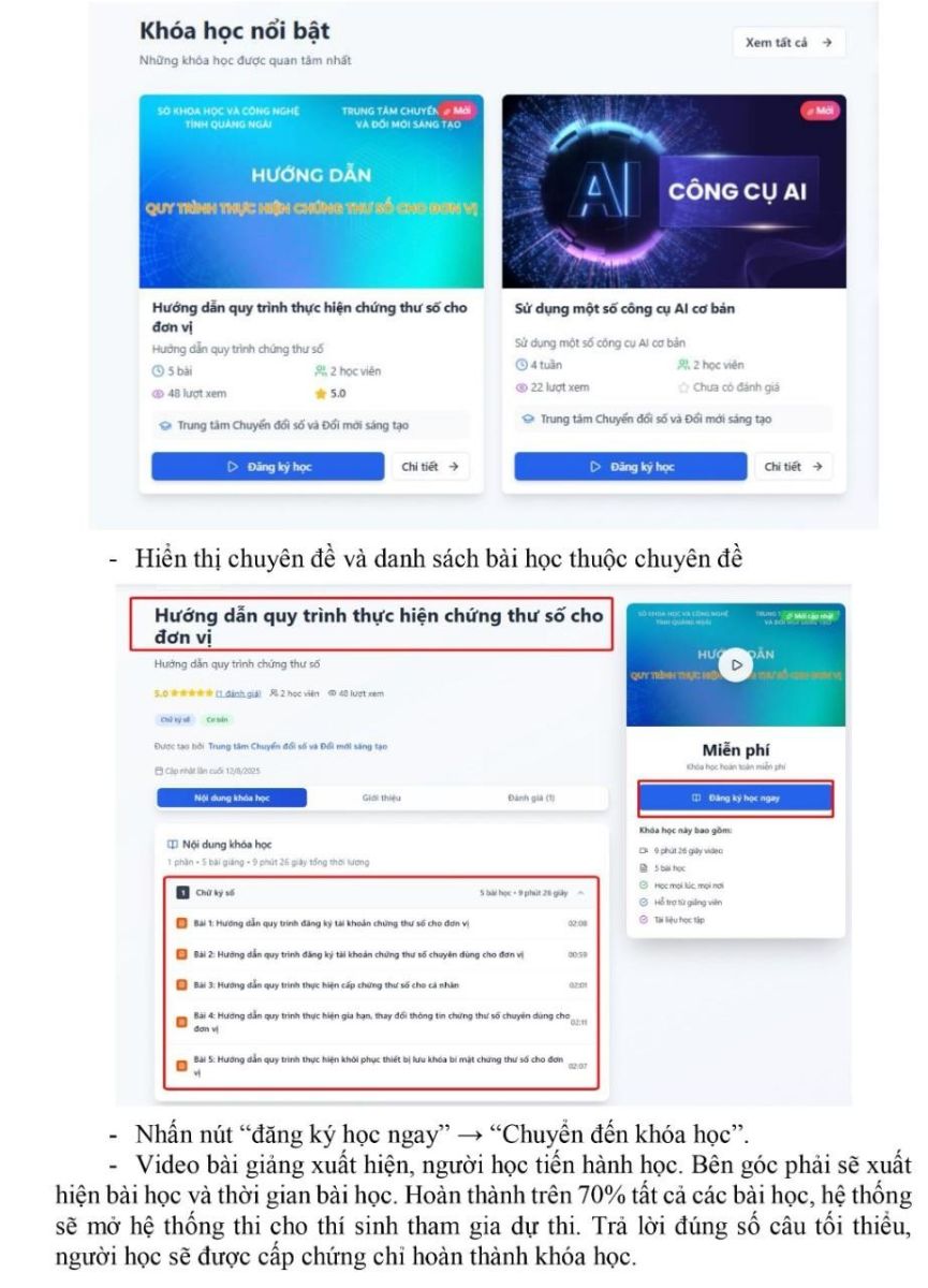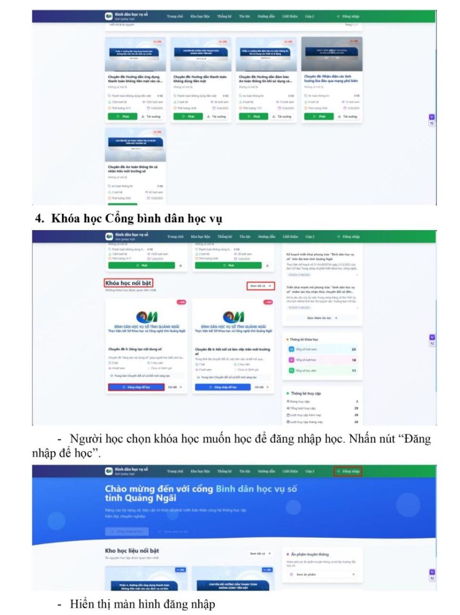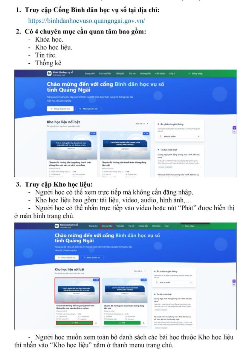Cán bộ, công chức, viên chức, đoàn viên, thanh niên, học sinh, sinh viên và các tầng lớp nhân dân xã Nghĩa Hành hưởng ứng, dành thời gian truy cập Cổng Bình dân học vụ số để đăng ký và tham gia các khóa học tại địa chỉ https://binhdanhocvuso.quangngai.gov.vn để sử dụng như sau: