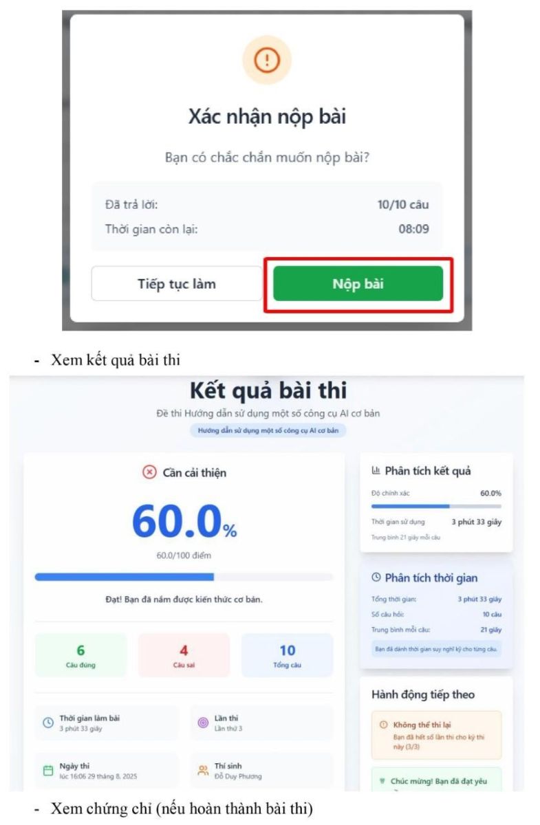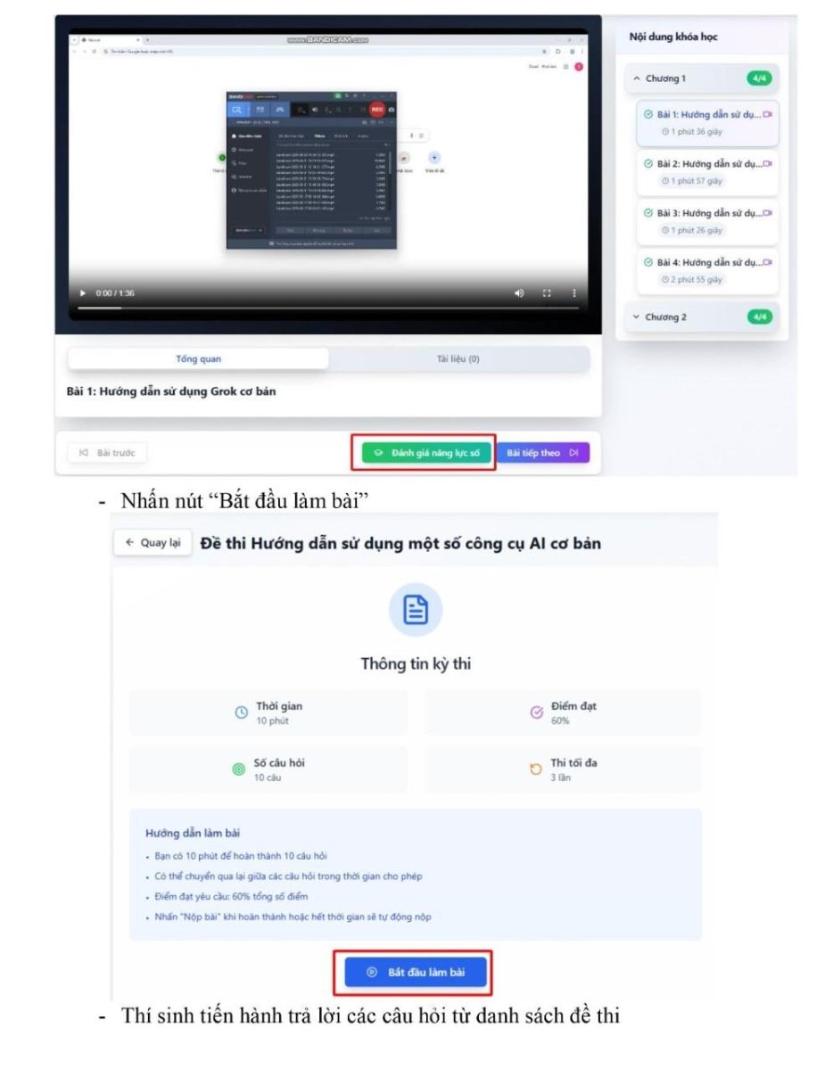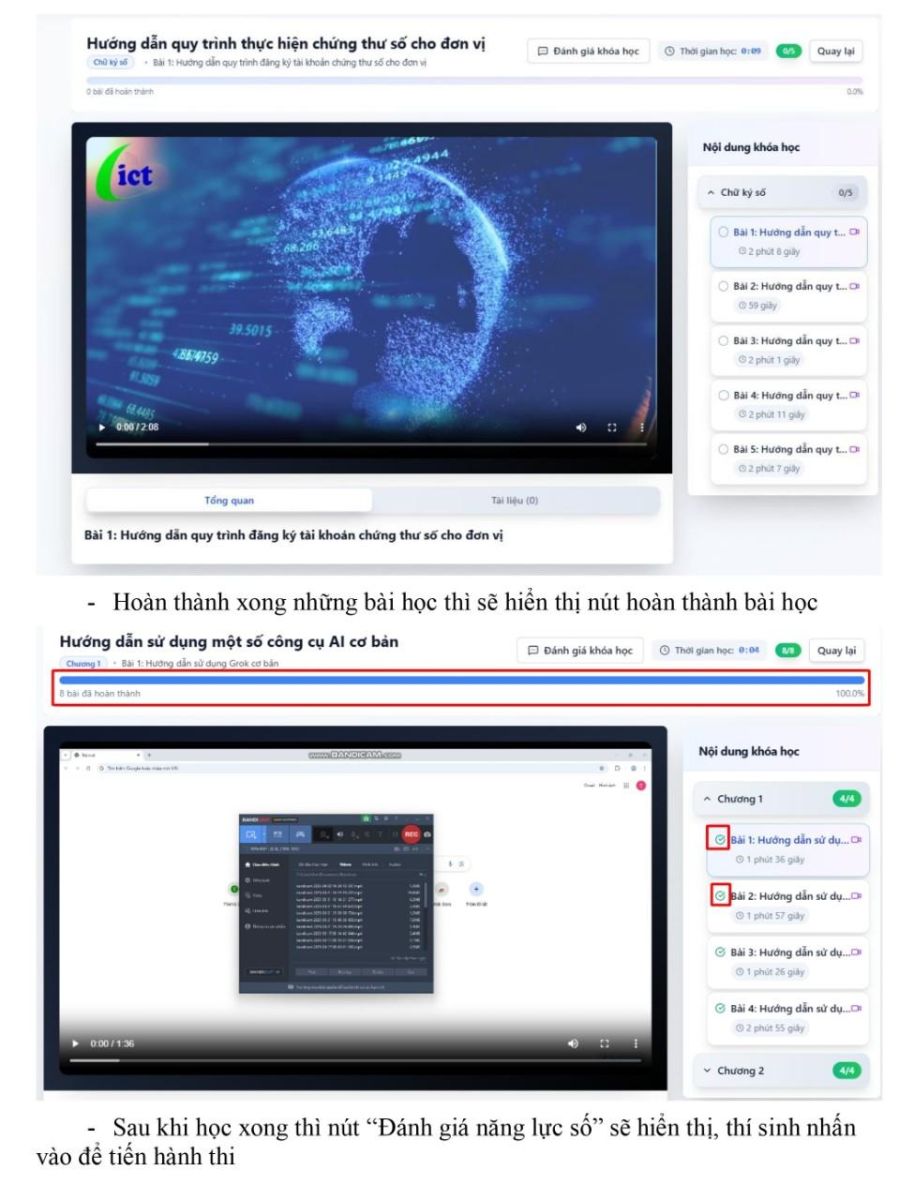 Sau khi hoàn thành các chuyên đề, học viên sẽ tham gia một bài kiểm tra trực tuyến để tổng kết và đánh giá kiến thức đã học. Những học viên hoàn thành khóa học và đạt yêu cầu của bài kiểm tra sẽ được cấp Giấy chứng nhận điện tử./