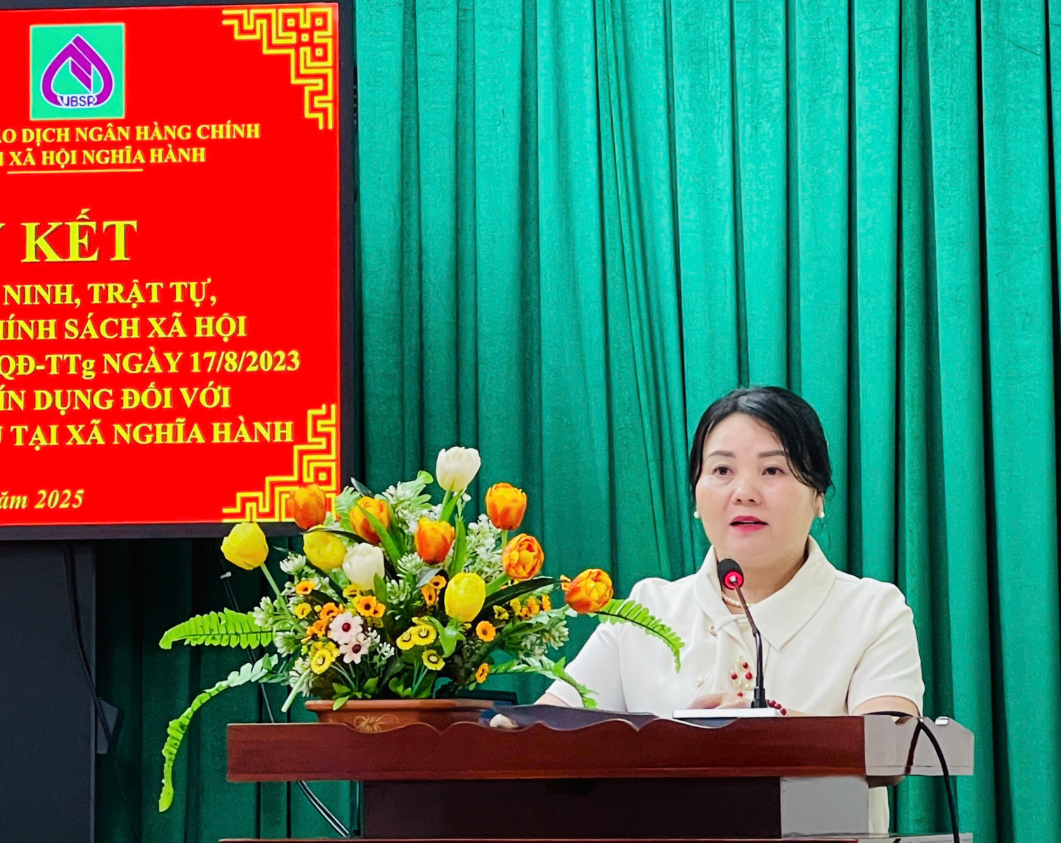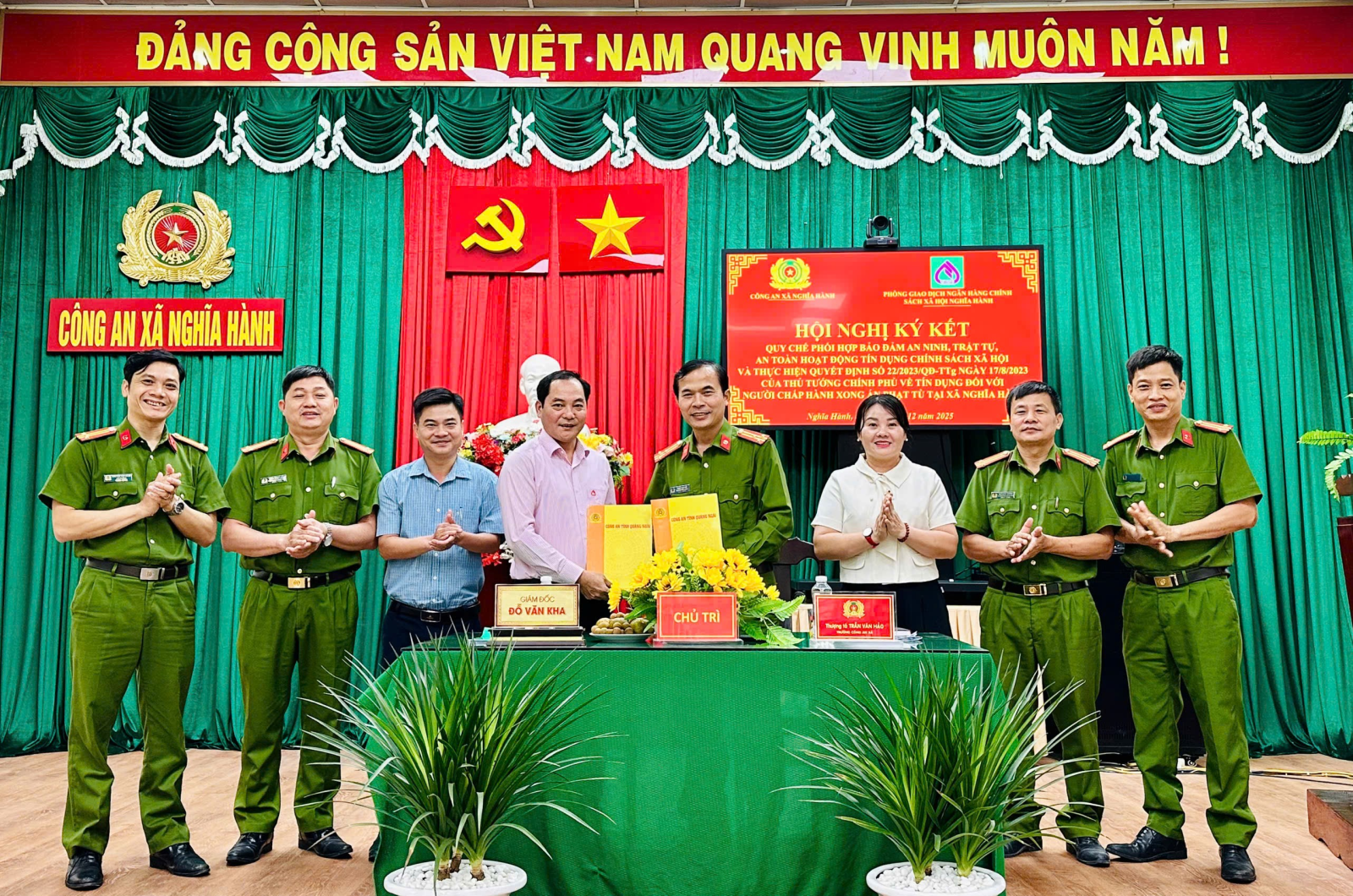 Phối hợp bảo vệ an ninh, trật tự, an toàn hoạt động tín dụng chính sách xã hội trên địa bàn xã; Rà soát, xử lý đối với khách hàng vay vốn tại Phòng giao dịch Ngân hàng Chính sách xã hội Nghĩa Hành đi khỏi nơi cư trú chưa thực hiện nghĩa vụ trả nợ vốn vay; Triển khai chính sách tín dụng đối với người chấp hành xong án phạt tù theo Quyết định số 22; Phối hợp khai thác, ứng dụng dữ liệu dân cư, định danh và xác thực điện tử trong hoạt động của Ngân hàng chính sách xã hội.