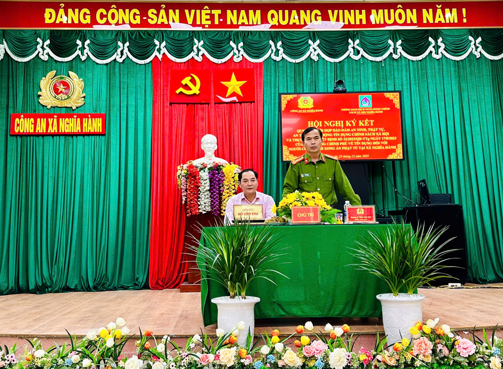 Công an xã và Phòng giao dịch Ngân hàng chính sách xã hội Nghĩa Hành phối hợp báo cáo sơ kết, đánh giá việc triển khai thực hiện Quy chế phối hợp. Tổ chức họp, giao ban đánh giá tình hình, kết quả thực hiện Quy chế phối hợp và Hội nghị sơ, tổng kết hiệu quả.