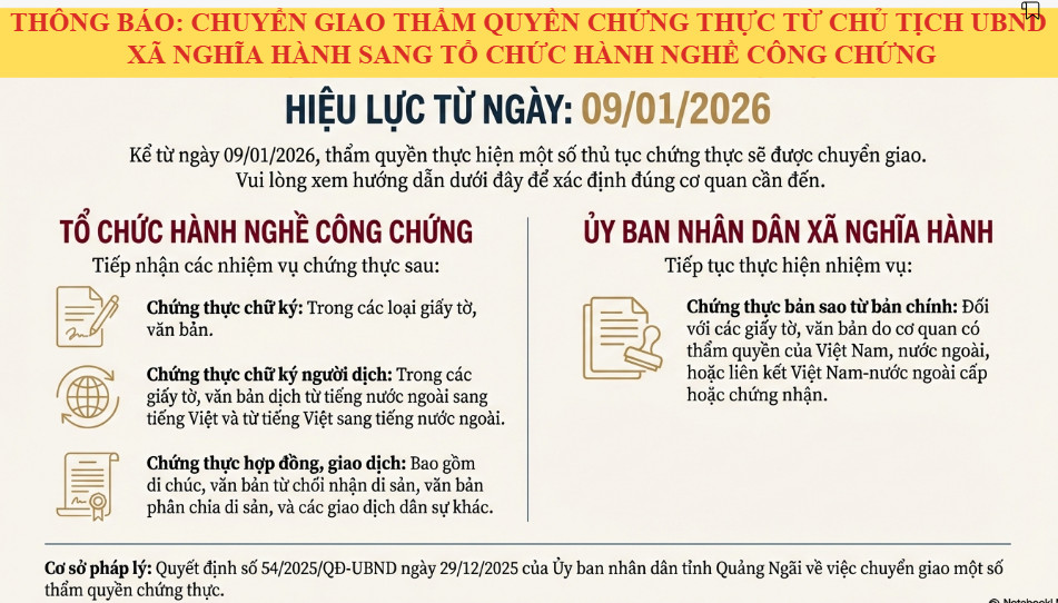 Thứ ba, 06/01/2026 | 13:43 A- A A+ | Chuyển giao thẩm quyền chứng thực từ Chủ tịch UBND xã Nghĩa Hành sang Tổ chức hành nghề công chứng Đọc bài Chia sẻ Lưu File đính kèm: