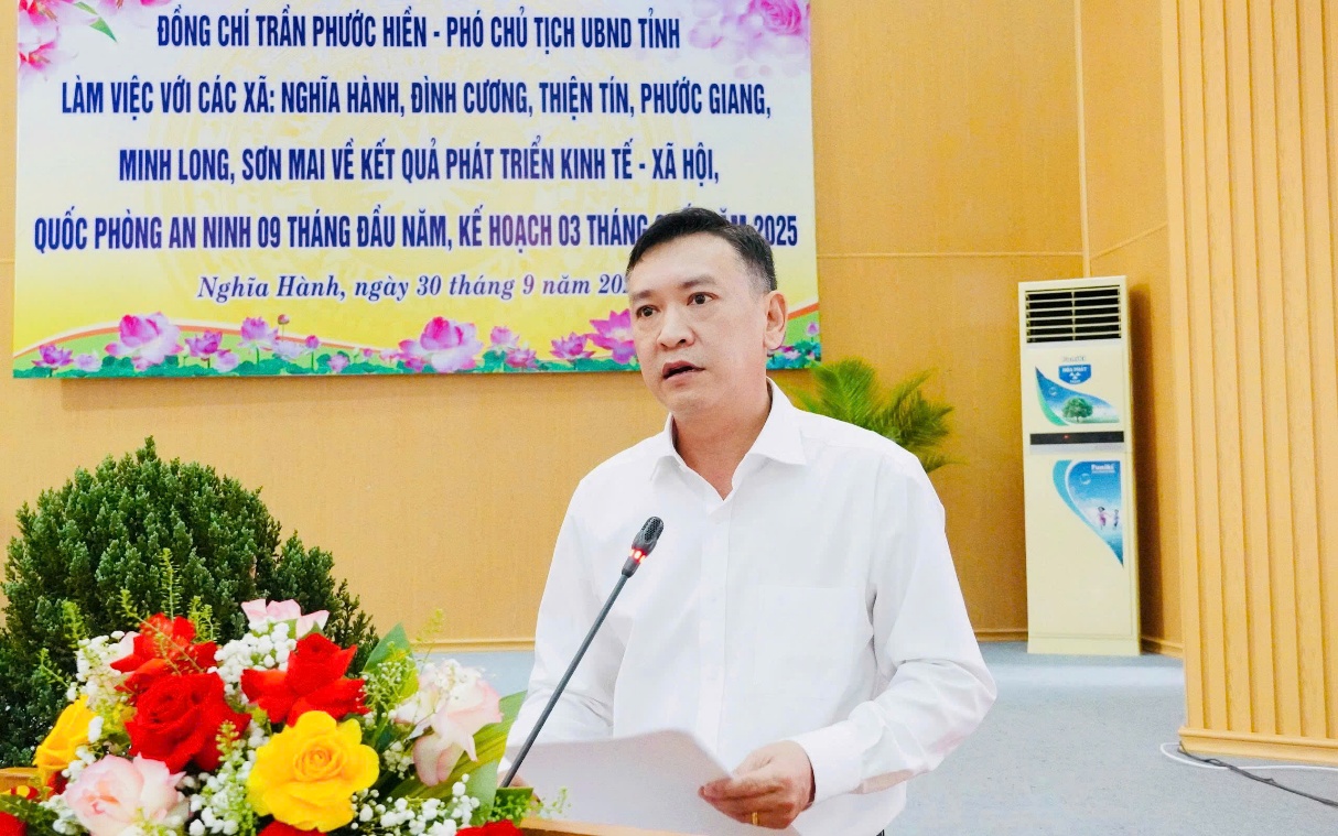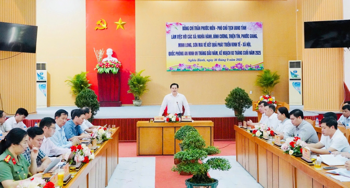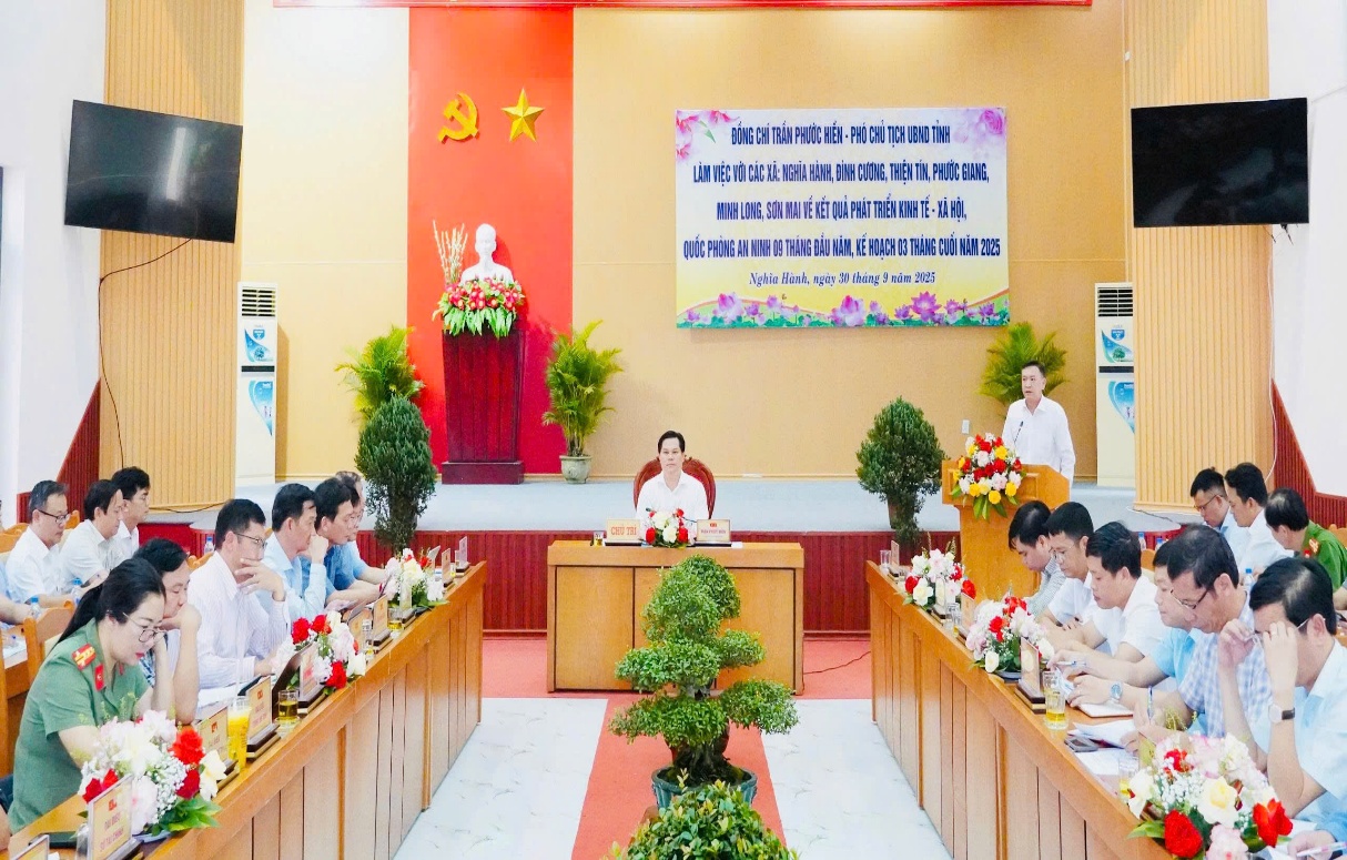 Sáng ngày 30.9, tại hội trường UBND xã Nghĩa Hành, đồng chí Trần Phước Hiền - Phó Chủ tịch UBND tỉnh làm việv với các xã Nghĩa Hành, Đình Cương, Thiện Tín, Phước Giang, Minh Long, Sơn Mai về phát triển kinh tế - xã hội, quốc phòng - an ninh 09 tháng và nhiệm vụ 03 tháng cuối năm 2025; Đánh giá tình hình hoạt động của UBND các địa phương sau sáp nhập, thực hiện mô hình chính quyền địa phương 2 cấp.