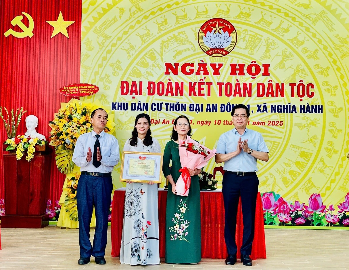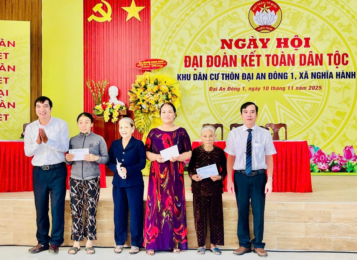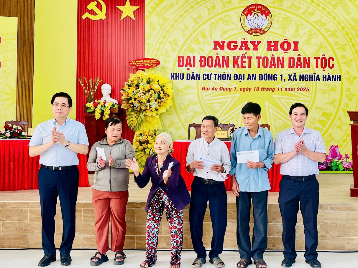 Dịp này, Chủ tịch UBND tỉnh Nguyễn Hoàng Giang trao Bằng khen của Ủy ban MTTQ Việt Nam tỉnh cho thôn Đại An Đông 1, là tập thể tiêu biểu, xuất sắc trong phong trào “Toàn dân đoàn kết xây dựng nông thôn mới, đô thị văn minh” giai đoạn 2021–2025. Lãnh đạo tỉnh và xã Nghĩa Hành tặng 10 suất quà cho hộ khó khăn, học sinh vượt khó, động viên bà con ổn định cuộc sống, các em tiếp tục vươn lên đạt thành tích cao trong học tập, rèn luyện. Công ty Thành Phát - Bia Dung Quất tặng Uỷ ban MTTQ Việt Nam xã 10 triệu đồng để chăm lo cho hộ nghèo trên địa bàn xã.
