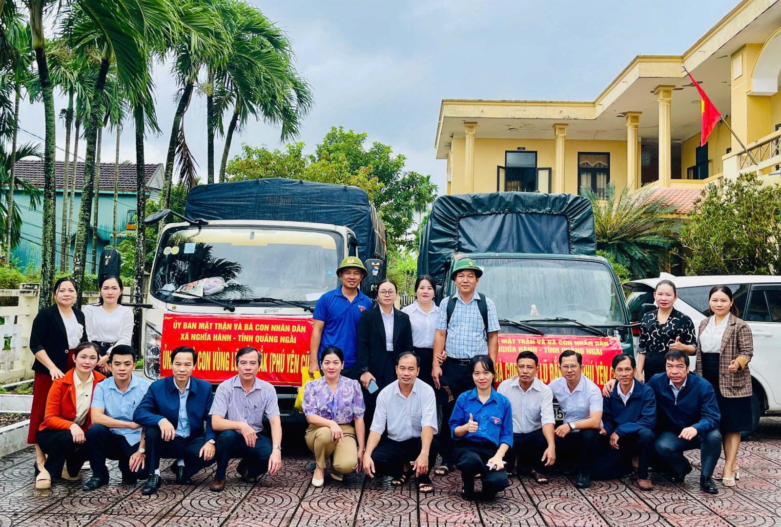Sáng 24/11/2025, 02 chuyến xe của xã Nghĩa Hành đã xuất phát vận chuyển 01 tấn gạo, 200 thùng mì, 50 thùng nước uống đóng chai, bánh ngọt, thức ăn sẵn đóng gói các loại; 01 tấn quần áo chăn màn… (trị giá 200 triệu đồng) do nhân dân và cán bộ xã Nghĩa Hành đóng góp, vào hỗ trợ bà con bị thiệt hại do lũ lụt ở xã Hoà Phú 1, Hoà Phú 2 (thuộc tỉnh Phú Yên cũ, nay là tỉnh Đắk Lắk).